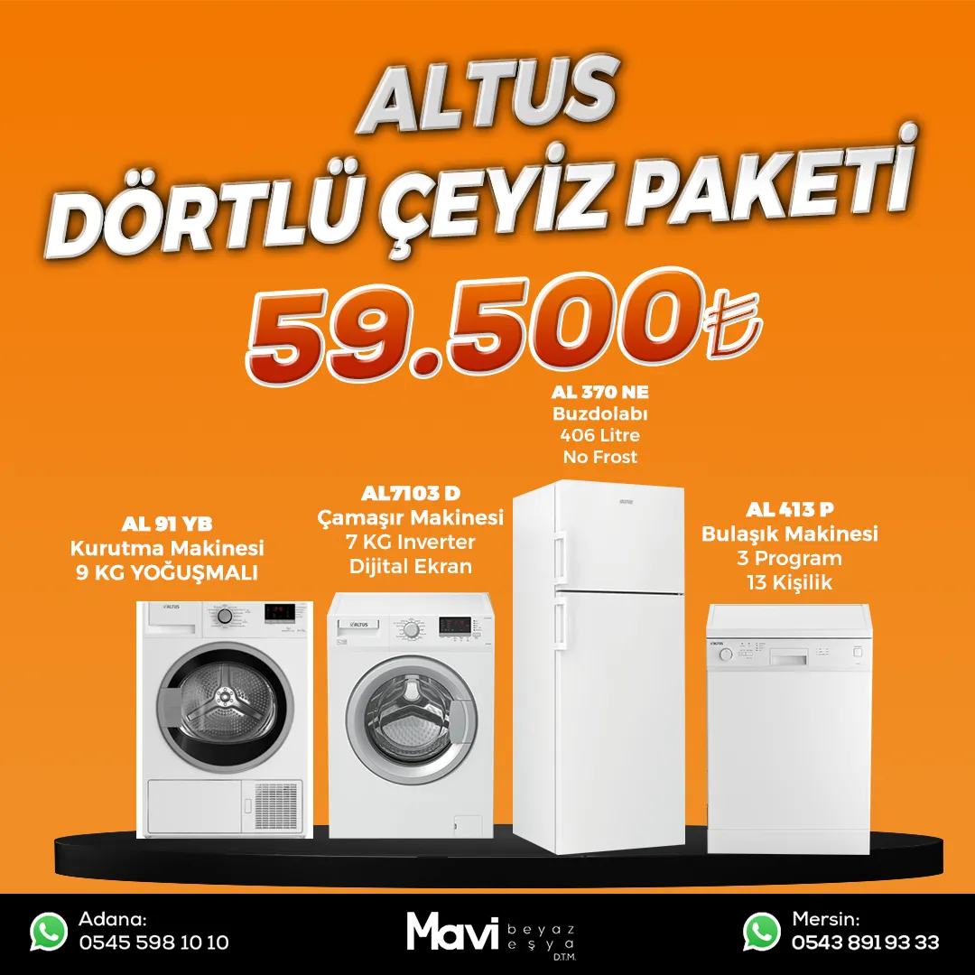 Altus AL 370 NE Nofrost BuzdolabıÜrün ÖzellikleriÜrün rengi BeyazDondurucu Yeri Dondurucu ÜstteKontrol Sistemi Mekanik SensörlüTatil Modu VarAydınlatma Sol yan duvarda LEDToplam hacim (L) 406 LKapı Yönü Değiştirme VarAmbalajsız Yükseklik (cm)(y) 185 cmAmbalajsız Derinlik (cm) 70 cmAmbalajsız genişlik (cm)(x) 70 cmAltus AL 7101 L 7 KG Çamaşır MakinesiÜrün ÖzellikleriKapasite (kg) 7 kgMaksimum Sıkma Devri 1000 rpmEnerji Sınıfı EProgram Sayısı 15Ürün Rengi BeyazAltus AL 413 P 3 Prog. Bulaşık MakinesiÜrün ÖzellikleriÜrün Rengi BeyazProgram Sayısı 3Ekran Tipi LEDGövde Tipi Paslanmaz Çelik GövdeEnerji Sınıfı ESes Sınıfı DKapasite 13ALTUS AL 92 YB KURUTMA MAKİNESİKapasite : 9 kgProgram Sayısı : 15 ProgramlıGenişlik : 60 cmDerinlik : 60 cmYükseklik : 85 cmTambur Hacmi : 110 ltEnerji Sınıfı : B