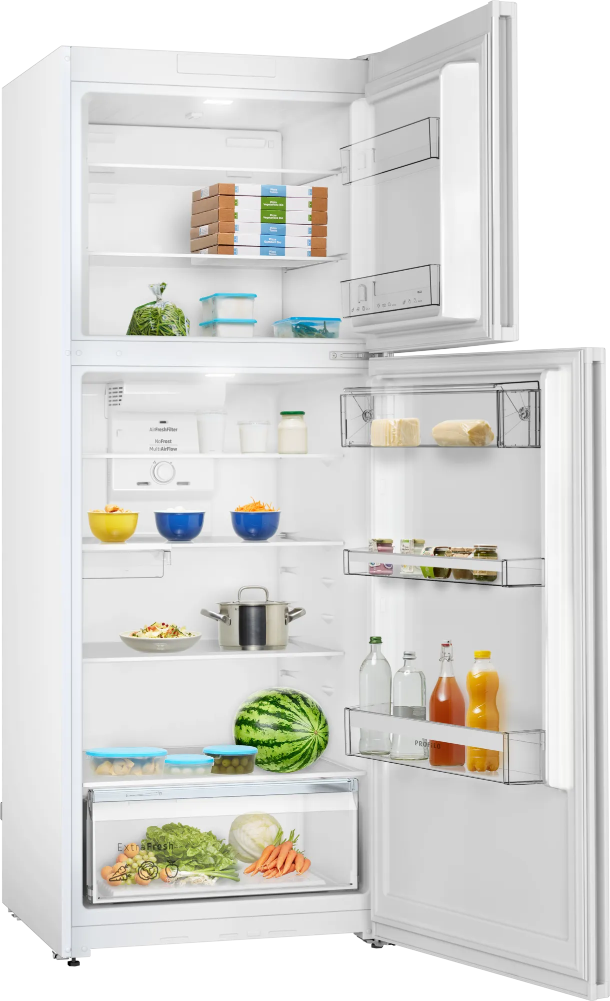 NoFrost Üstten Donduruculu Buzdolabı, Fresh tazelik sistemiyle aileniz için daha fazla saklama kapasitesi ve yiyecekleriniz için uzun süreli tazelik sağlar. NoFrost teknolojisi sayesinde zaman ve enerji tüketen çözdürme işlemine gerek kalmaz. ExtraFresh çekmecesi meyve ve sebzeleriniz için daha uzun süre tazelik sağlar. ExtraFresh ile Daha Uzun Süre Tazelik Özellikle kalabalık aileler için yiyeceklerinin uzun süre taze kalması önemlidir. Kolaylıkla ayarlanabilen nem kontrol mekanizmasıyla ExtraFresh çekmecesi sebze ve meyvelerinizi daha uzun süre taze tutar, böylece yiyeceklerinizi besin değerleri ve vitaminlerini koruyarak keyifle tüketebilirsiniz. Daha uzun süre tazelik gıda israfının önlemesi ve market alışveriş sıklığınızı azaltmaya da yardımcı olur. Led aydınlatma, optimum konumu sayesinde soğutucu içerisinde aydınlık bir ortam yaratır. Ürün BilgileriRenkBeyazKapı yönüDiğerKapı kolu tipiDikey kapı koluKullanma şekliKapı açık kaldığında uyarı sinyali, Süper dondurma fonksiyonuEnerji verimlilik sınıfı1EYıllık ortalama enerji tüketimi3268 kWh/yılSes seviyesi41 dB(A) re 1pWSes verimllik sınıfıCSoğutucu bölümü kapasitesi335 litreDerin dondurucu bölümü kapasitesi118 litreEntegre aksesuarlar3 x YumurtalıkBoyutlarİç Ünite Ölçüler (Yükseklik x Genişlik x Derinlik) 1860 x 700 x 745 mmNet Ağırlık78,7 kgKonforExtraFresh EvetExtraFresh Comfort hayırSüper dondurma EvetEcoMode EvetMultiAirflow EvetSoğutucu bölümüBuzdolabı raf adedi 4Soğutucu bölümü ayarlanabilir raf adedi 3Yumurtalık adedi 3Buzdolabı kapı rafı adedi 2Soğutucu bölümü aydınlatması LEDDondurucu bölümüYıldız sınıfı 4Elektrik kesintisinde saklama süresi (h) 13 hDondurucu bölümü çekmece adedi 0Dondurucu kanatçık sayısı 0Dondurucu bölümü aydınlatmasıLED
