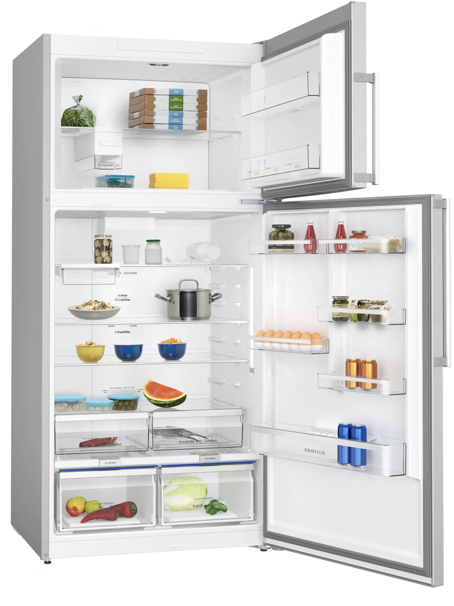 Profilo NoFrost Üstten Donduruculu XXL Buzdolabı'nın geniş saklama kapasitesi sayesinde çok alan kaplayan bol miktardaki yiyeceği kolayca saklayabilirsiniz. ExtraCold <> 0 ° C Comfort çekmecesi et, balık, şarküteri ve kahvaltılık ürünleriniz için etkili koruma ve 2 kata kadar uzun süre tazelik sağlar.NoFrost teknolojisi sayesinde zaman ve enerji tüketen çözdürme işlemine gerek kalmaz. Misafirleriniz ne kadar kalabalık olursa olsun, kullanımı kolay Buzmatik sayesinde buzlar her zamankinden daha hızlı hazır.AirFresh Filtresi, buzdolabınızdaki kokuları yok ederek içerideki havayı daima temiz ve ferah tutar.Genel ÖzelliklerRenkKolay temizlenebilir InoxKapı yönüDiğerKapı kolu tipiDikey kapı koluKullanma şekliKapı açık kaldığında uyarı sinyali, Soğutucu sıcaklık göstergesi, Süper dondurma fonksiyonu, Süper soğutma fonksiyonuEnerji verimlilik sınıfı1DYıllık ortalama enerji tüketimi3243 kWh/yılSes seviyesi39 dB(A) re 1 pWSes verimllik sınıfıCSoğutucu bölümü kapasitesi493 litreDerin dondurucu bölümü kapasitesi148 litreEntegre aksesuarlar3 x YumurtalıkBoyutlarİç Ünite Ölçüler (Yükseklik x Genişlik x Derinlik)1860 x 860 x 800 mmNet Ağırlık103,5 kgBoyutlar KonforExtraFreshEvetExtraFresh ComfortEvetSüper SoğutmaEvetSüper dondurmaEvetŞişe rafı tipiPlastik şişelikBigBoxhayırVarioZonehayırEasyAcces cam rafEvetEcoModehayırBasic touch controlhayırMultiAirflowEvetSoğutucu bölümüBuzdolabı raf adedi4Soğutucu bölümü ayarlanabilir raf adedi3Yumurtalık adedi3Buzdolabı kapı rafı adedi6Soğutucu bölümü aydınlatmasıLED with soft startDondurucu bölümüYıldız sınıfı4Elektrik kesintisinde saklama süresi (h)14 hDondurucu bölümü çekmece adedi0Dondurucu kanatçık sayısı0Dondurucu bölümü aydınlatmasıLEDHome ConnectHome Connect2hayırKamerahayır