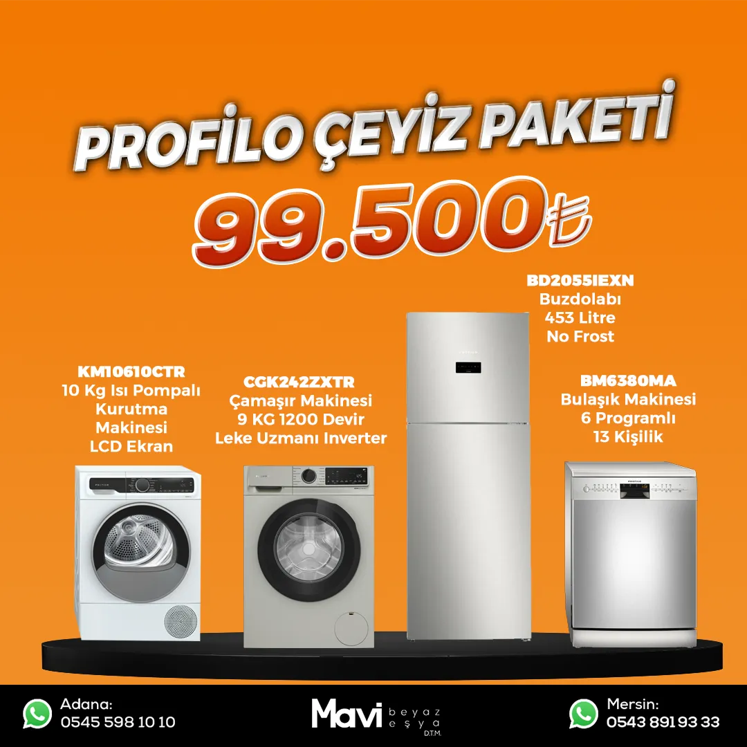 BD2055IEXN Buzdolabı Genel BilgilerNo-FrostToplam hacim: 453 lÖlçüler (Yükseklik x Genişlik x Derinlik) 1860 x 700 x 745 mmCGK242ZXTR 1200 Devir 9 KG Çamaşır MakinesiYıkama Kapasitesi – 9,0 kgMaksimum sıkma devri 1.200 rpmRenk GümüşBM6380MA Bulaşık MakinesiKapasite: 13 kişilikEnerji verimlilik sınıfı¹: D6 ProgramProfilo KM10610CTR 10 kg Çamaşır Kurutma Makinesi10 KG KAPASİTEISI POMPALI