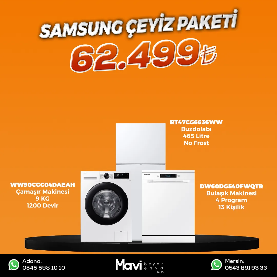 Samsung RT47CG6636WW 465 Lt Nofrost BuzdolabıTeknik Özellikler Soğutucu (Litre)465 ?Dondurucu (Litre)108 ?Net Ağırlık (kg)63 kgNet Boyut (GxYxD) (mm)700 *1825*717 mm Samsung WW90CGC04DAEAH Çamaşır MakinesiYıkama Kapasitesi 9,0 kgEnerji Verimlilik Sınıfı APanel Ekranı LEDÖn Yıkama EvetHızlı Yıkama EvetSıkma Hızı 1400 devirSamsung DW60DG540FWQ Bulaşık Makinesi Teknik ÖzelliklerProgram sayısı 4Yoğun EvetHassas EvetEko EvetEkspres 60 Evet