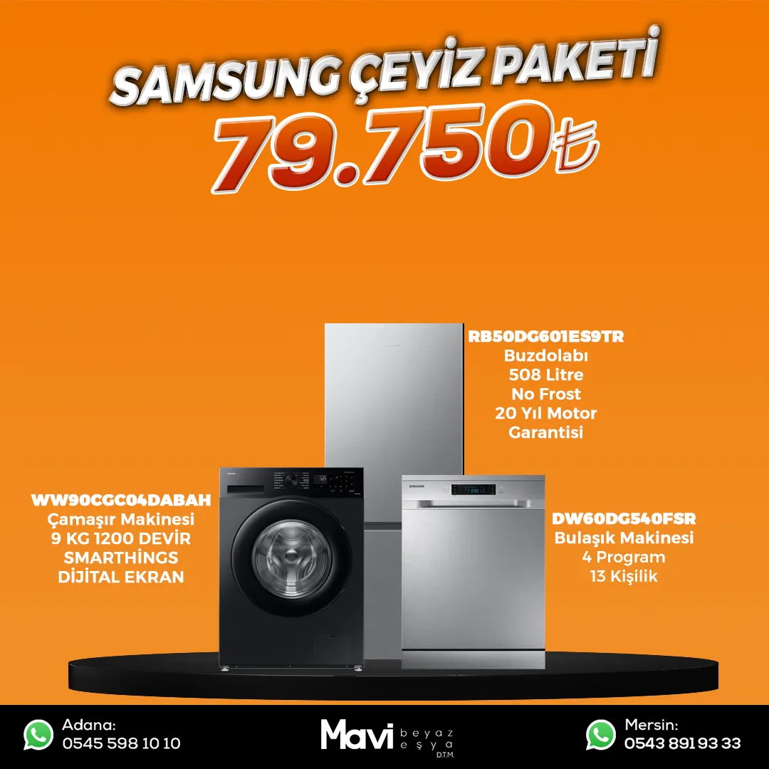 Buzdolabı RB50DG601ES9 SAMSUNGTeknik ÖzelliklerEkstra geniş, daha az enerjiProaktif tasarruflarİçeride daha fazla alanNet Genişlik (mm) 759 Net Menteşeli Kasa Yüksekliği (mm) 1920 Kapı Kolu ile Net Derinlik (mm) 711 Net Ağırlık (kg) 87 Soğutma Tipi Mono soğutmaEnerji Verimlilik Sınıfı EKapasiteSoğutucu (Litre) 508 Dondurucu (Litre) 168 Soğutucu (Litre) 340 WW90CGC04DABAH Çamaşır MakinesiTeknik Özellikler Yıkama Kapasitesi9,0 kgEcoBubble™ Köpükle Yıkama TeknolojisiEvetEnerji Verimlilik SınıfıAFiziksel Özellikler600 x 850 x 550 mmNet Ağırlık65 kgPanel EkranıLEDYıkama Kapasitesi9,0 kg DW60DG540FSR Bulaşık Makinesi Teknik ÖzelliklerProgram sayısı 4Yoğun EvetHassas EvetEko EvetEkspres 60 EvetRenk: İnox